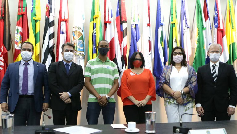 Da esquerda para a direita: Quirino Cordeiro, Sérgio Queiroz, Wesley Jacinto, Damares Alves, Mariana Neris, Rolf Hartmann (Foto: Ronaldo Caldas / Ministério da Cidadania)