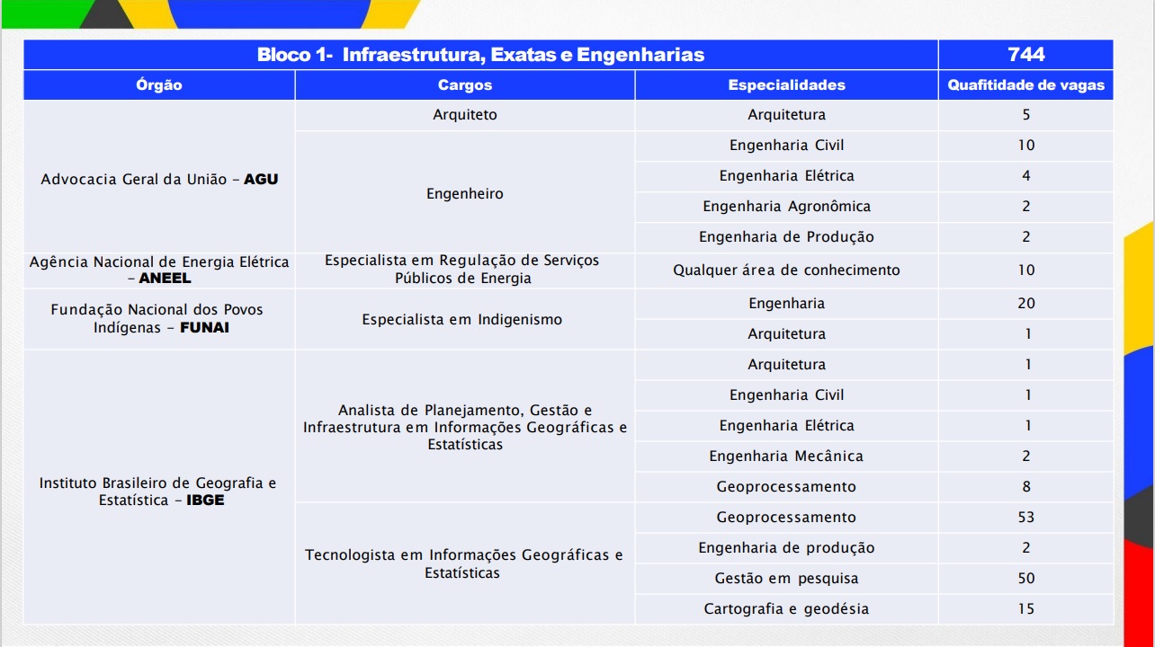 Veja os blocos temáticos, órgãos, cargos, especialidades, quantidade de vagas e a relação candidato/vaga