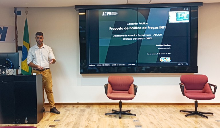 Em evento na sede do INPI, no Rio de Janeiro, o economista-chefe do Instituto, Rodrigo Ventura, apresentou nesta quarta-feira, dia 08 de janeiro, a proposta de Política de Preços do INPI, que está em consulta pública até a próxima sexta-feira, dia 10, realizada em parceria com o Ministério do Desenvolvimento, Indústria, Comércio e Serviços (MDIC).