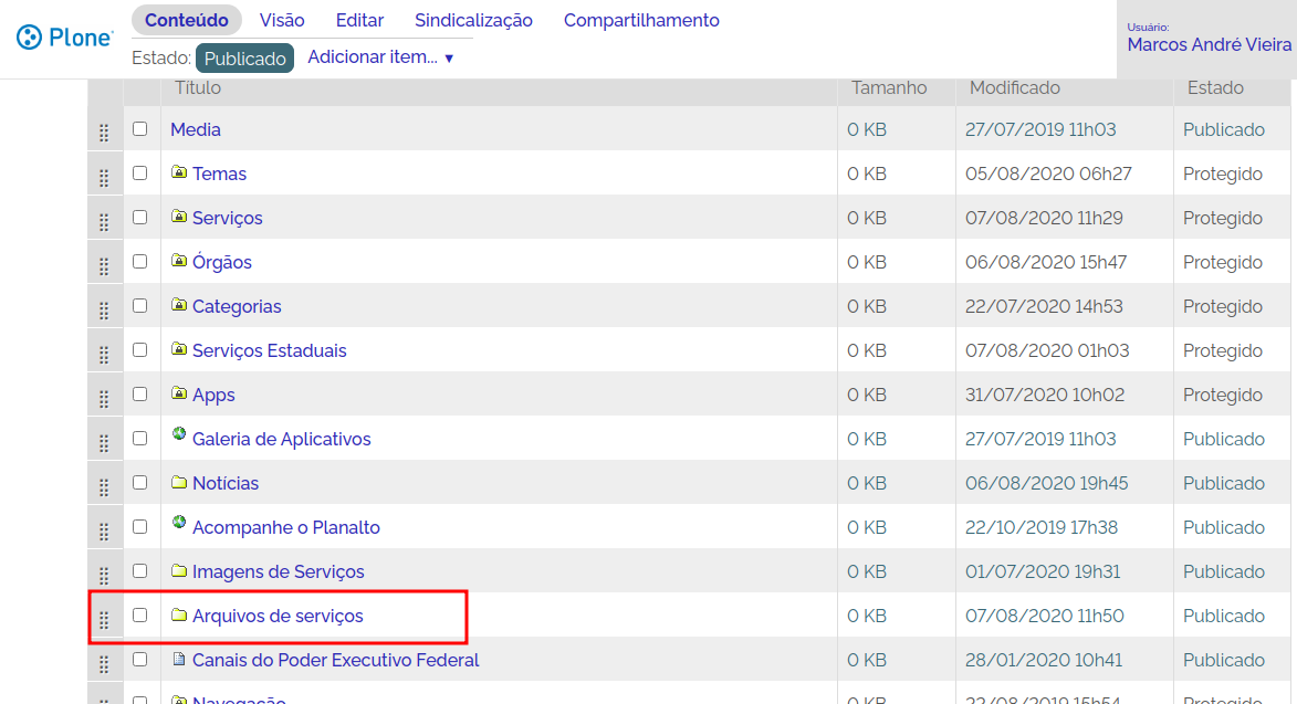 Aparecerá então para você o conteúdo da pasta principal do gov.br. Nestas pastas ficam os arquivos, imagens, páginas e outras pastas usadas pelo Portal.