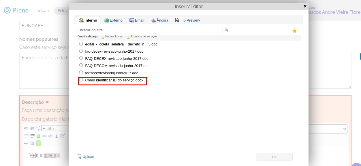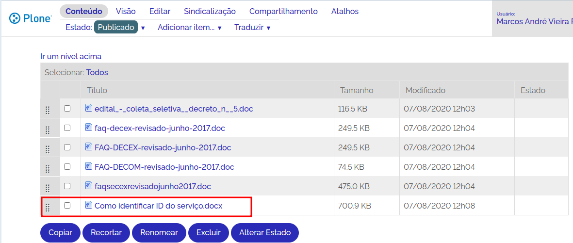 Agora você deve ir para a página do serviço onde você deseja incluir o arquivo. Se o serviço já estiver publicado, você precisará liberá-lo para edição. Para fazer isso, você deve ir ao canto superior esquerdo da tela e clicar onde está escrito "Publicado". Aparecerá um menú suspenso com algumas opções, clique então na primeira, "Liberar para edição".