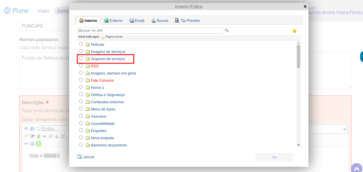 Aparecerá uma janela pop-up para você. No topo dela estão as tags para três abas, um campo de busca e logo abaixo dele está escrito "Você está aqui: Página Inicial - Serviços". Clique onde está escrito "Página Inicial".