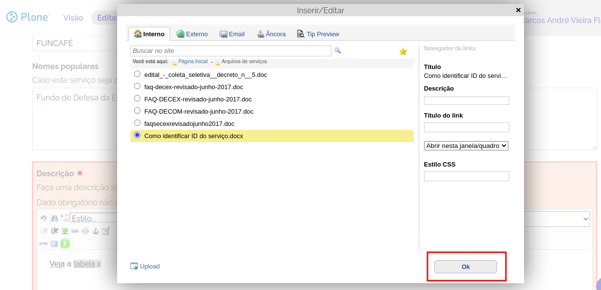 No campo, você deve selecionar a palavra ou frase onde deseja incluir o link para o arquivo e em seguida clicar no botão "inserir/editar hyperlink", que é o botão com a imagem de uma corrente nas ferramentas de edição (conforme imagem).
