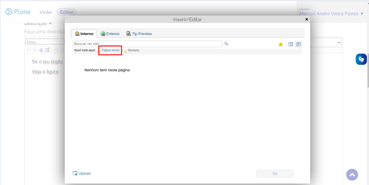 Aparecerá uma janela pop-up para você. No topo dela estão as tags para três abas, um campo de busca e logo abaixo dele está escrito "Você está aqui: Página Inicial - Serviços". Clique onde está escrito "Página Inicial".