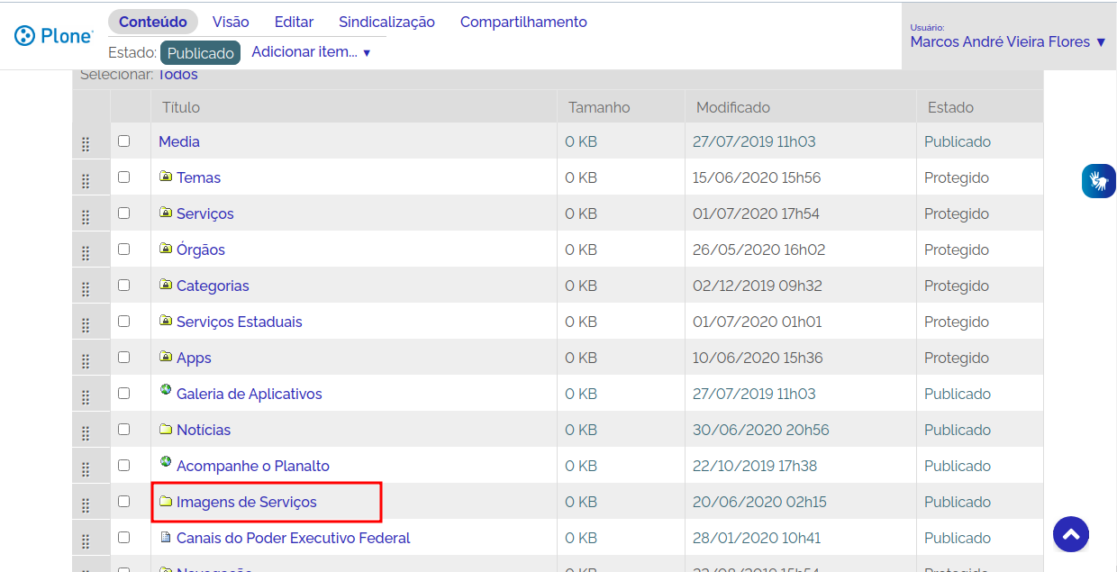 Aparecerá então para você o conteúdo da pasta principal do gov.br. Nestas pastas ficam os arquivos, imagens, páginas e outras pastas usadas pelo Portal.
