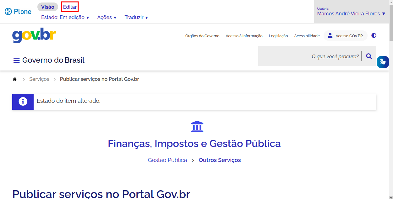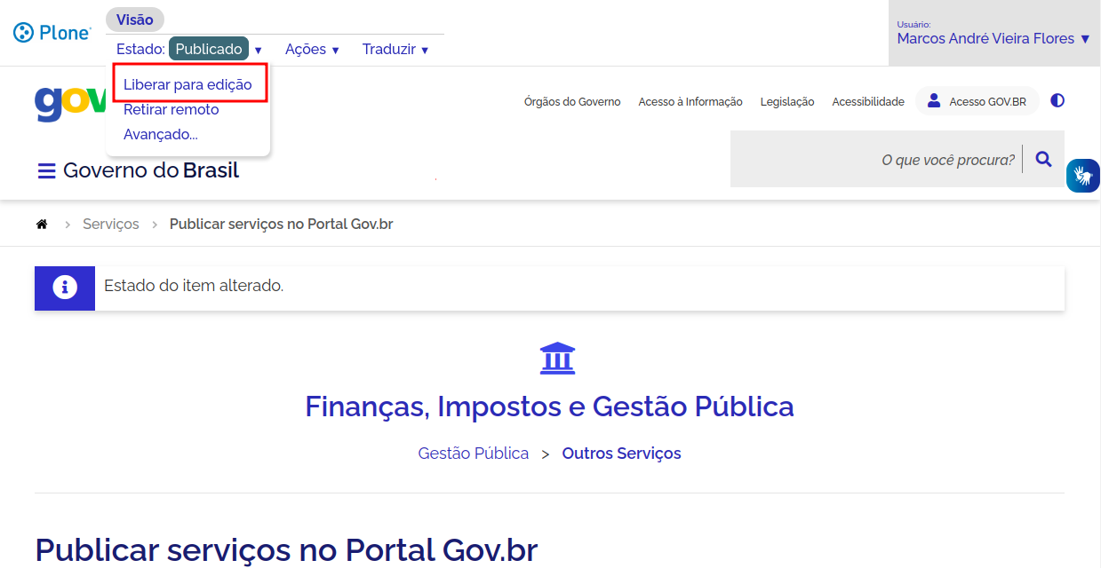 Agora você deve ir para a página do serviço onde você deseja incluir a imagem. Se o serviço já estiver publicado, você precisará liberá-lo para edição. Para fazer isso, você deve ir ao canto superior esquerdo da tela e clicar onde está escrito "Publicado". Aparecerá um menú suspenso com algumas opções, clique então na primeira, "Liberar para edição".