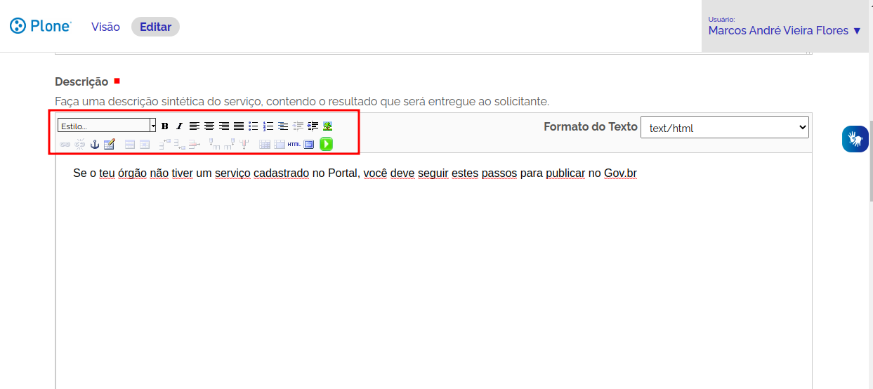 É importante que você veja se o campo do serviço em que a inclusão da imagem foi pedida pode ter imagens. Apenas os campos que tem as ferramentas de edição (veja a figura ao lado) podem apresentar imagens.