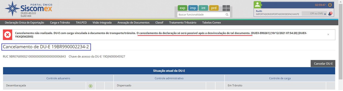 Importante: quando a solicitação de cancelamento é registrada, automaticamente o sistema registrará o bloqueio de embarque da carga em nome do usuário que solicitou o cancelamento. O desbloqueio, se necessário, deve ser feito pelo próprio declarante.
