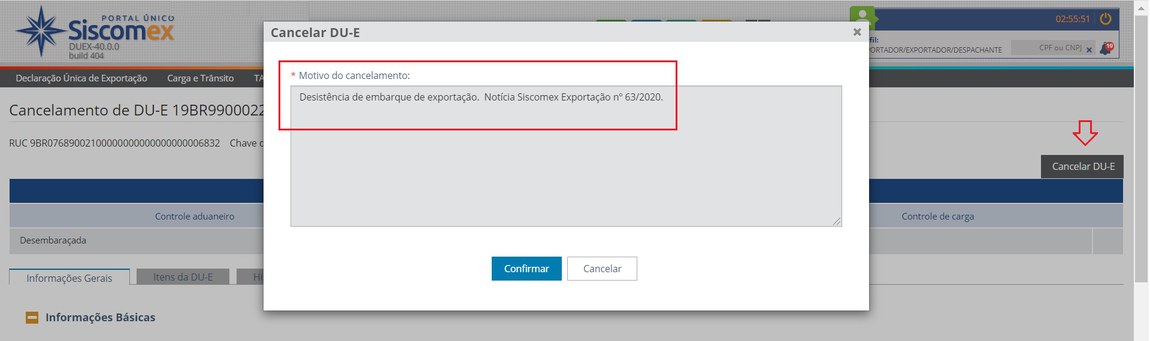 - Regra geral, as principais causas que levam a um cancelamento são a desistência da exportação, quando se comprova que a mercadoria não embarcou, ou quando não for possível o atendimento de uma exigência fiscal formulada no curso do despacho. A Notícia Siscomex Exportação nº 63/2020 estabelece as hipóteses de cancelamento de DU-E.