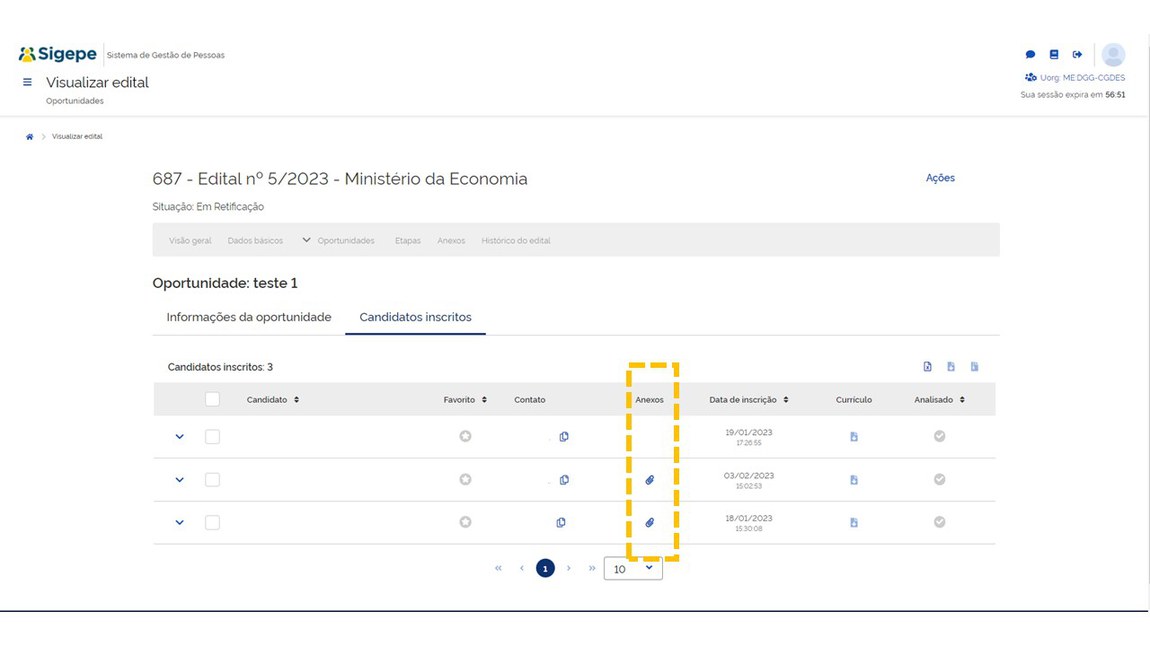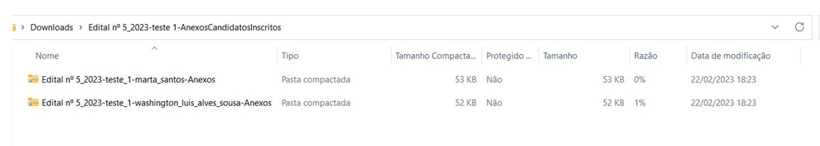 Fazendo o download de múltiplos anexos, os arquivos salvos estarão identificados com número e ano do edital, nome da oportunidade, nome do candidato.