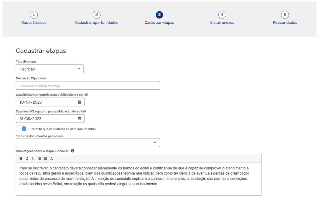 Ao cadastrar uma etapa no edital, como por exemplo, a etapa de inscrição, habilite a função “Permitir que candidatos enviem documentos”.