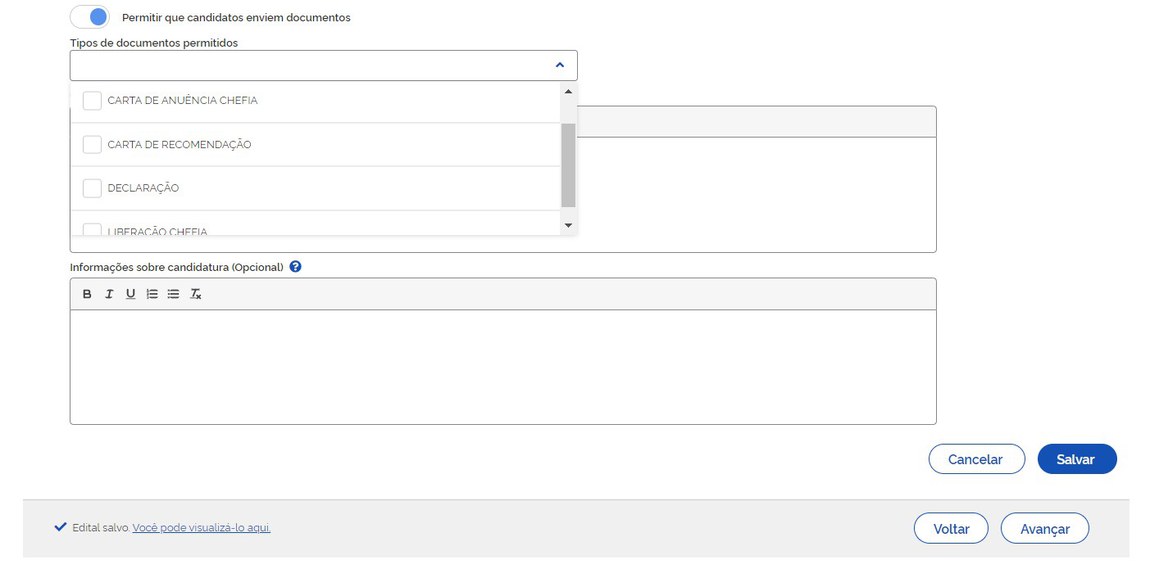Ao criar um novo edital, é possível habilitar a função de solicitação de envio de documentos pelos candidatos. Essa função foi sugerida por usuários do sistema, e elimina a necessidade de realização de procedimentos paralelos, como por exemplo, recebimento de documentos por e-mail.