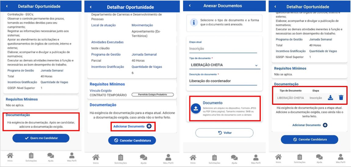 O candidato deverá clicar em "Adicionar Documento" e fazer o upload do arquivo solicitado. O candidato pode substituir o arquivo encaminhado durante o período de duração da etapa. As orientações detalhadas para o candidato estão disponíveis aqui