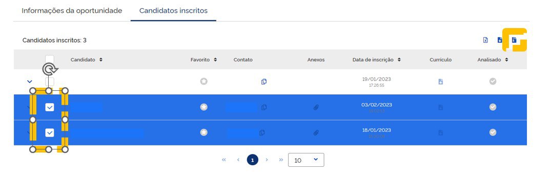 Os arquivos encaminhados pelos candidatos estarão disponíveis para o Gestor de oportunidades na seção “Candidatos inscritos” da Oportunidade: