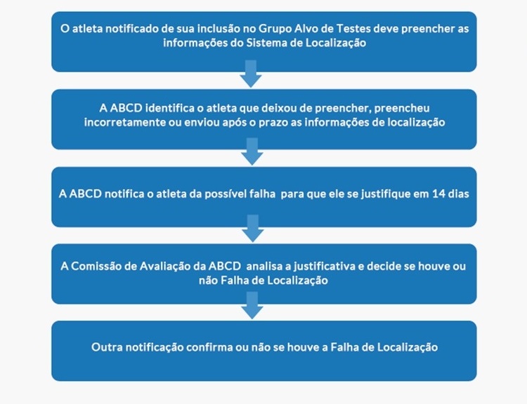 Um atleta notificado para compor o Grupo Alvo de Testes da ABCD – Autoridade Brasileira de Controle de Dopagem precisa fornecer informações de localização a cada trimestre. Caso ele deixe de preencher essas informações, envie após o prazo, ou preencha os dados incorretamente, a ABCD identifica uma Possível Falha de Localização.