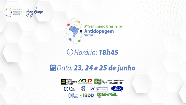 As inscrições para o 3º Seminário Brasileiro Antidopagem estão abertas. O evento virtual acontecerá entre os dias 23 e 25 de junho, a partir das 18h45, com duração diária de uma hora e meia. Promovido pela Autoridade Brasileira de Controle de Dopagem (ABCD) junto aos seus parceiros institucionais, o seminário contará com palestras, mesas redondas, painéis e convidados internacionais da Agência Mundial Antidopagem (AMA-WADA) e da Autoridade Antidopagem de Portugal (ADoP).