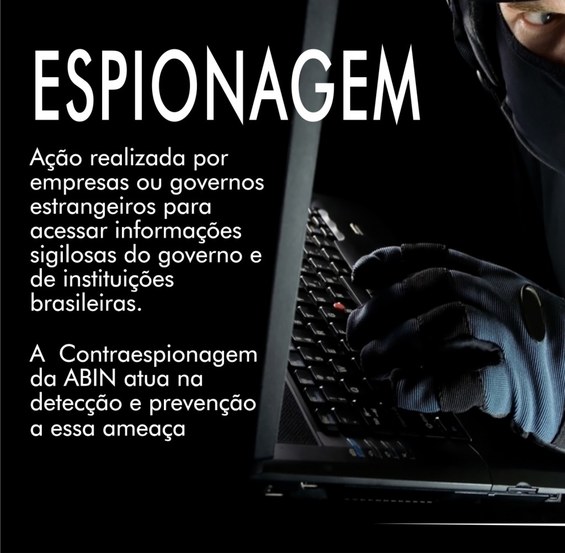 A espionagem é a ação realizada por um agente adverso que busca obter, de maneira clandestina, acesso a informações sensíveis ou sigilosas do governo brasileiro e de instituições nacionais para beneficiar outros países, organizações, grupos de interesse ou empresas.