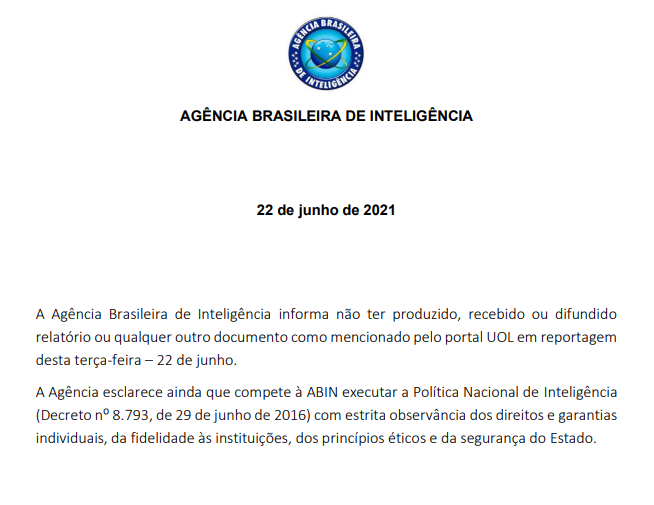 Agência não produziu relatório ou qualquer outro documento como mencionado pelo portal UOL