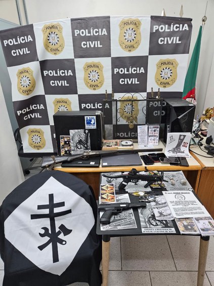 Foi apreendido farto material de apologia ao nazismo e ao fascismo, como símbolos, literatura nazista, celulares, equipamentos eletrônicos, uma garrucha, simulacros de arma de fogo e munições de diversos calibres.