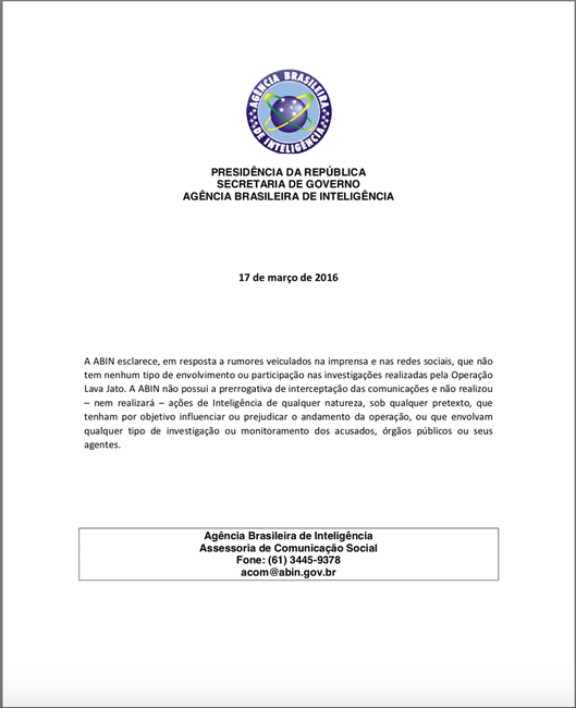 Nota oficial da Agência Brasileira de Inteligência