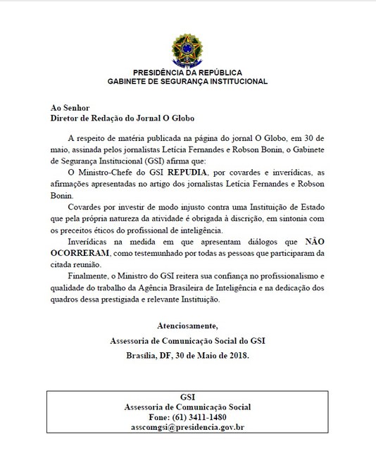 GSI divulga nota em resposta à matéria do jornal O Globo