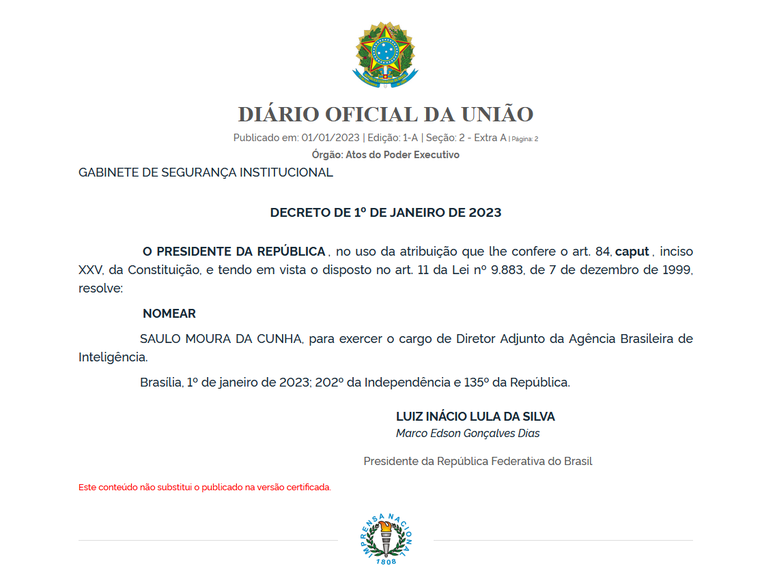 O oficial de Inteligência Saulo Moura da Cunha foi nomeado diretor adjunto da Agência Brasileira de Inteligência (ABIN) em publicação no Diário Oficial da União (DOU) deste domingo – 1º de janeiro de 2023.
