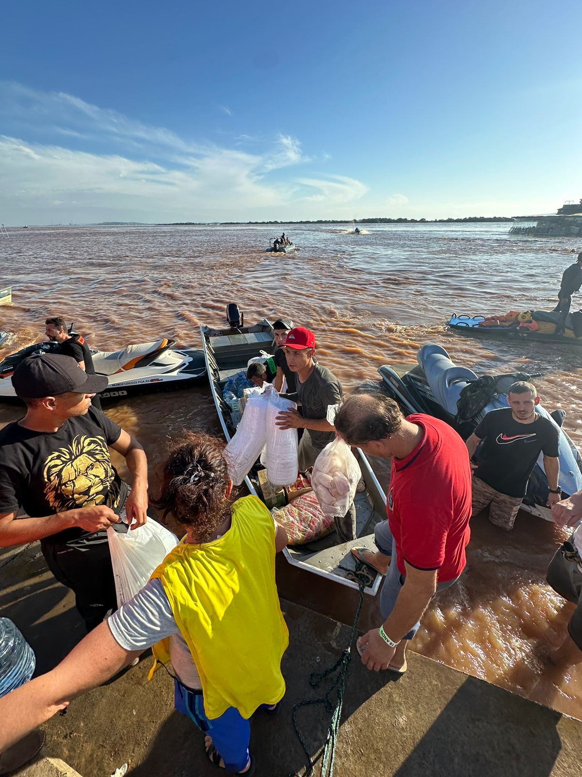 1. Material de higiene pessoal, fraldas infantis, leite, água e biscoitos para abrigos em Eldorado do Sul, cidade que está quase completamente submersa, via barcos que saíram do Gasômetro de Porto Alegre;