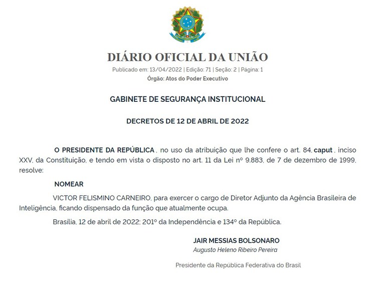 O oficial de Inteligência Victor Felismino Carneiro foi nomeado diretor-adjunto da ABIN em publicação no Diário Oficial da União (DOU) desta quarta-feira – 13 de abril. Ele exercerá a direção da Agência interinamente, uma vez que o então diretor-geral, Alexandre Ramagem, teve sua exoneração publicada no Diário Oficial em 31 de março, a pedido.