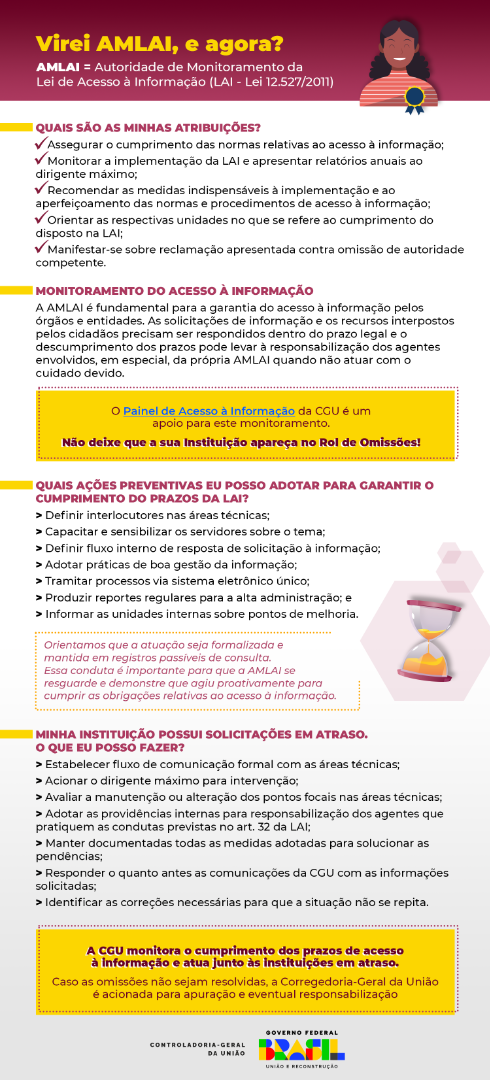 Quais são as ações de monitoramento das omissões? 1. Envio de e-mail de monitoramento para os responsáveis pelo SIC do órgão ou da entidade omissa; 2. Interlocução com o órgão ou a entidade com pedidos em atraso para esclarecimentos; 3. Envio de ofício destinado à Autoridade de Monitoramento da LAI (art. 40 da Lei nº 12.527/2011); 4. Envio de ofício para o Dirigente Máximo do órgão ou da entidade; 5. Envio de nota técnica à Corregedoria-Geral da União, acerca do descumprimento da LAI, para apuração de responsabilidades e eventual aplicação de sanção, conforme previsto no art. 32 da Lei nº 12.527/2011.
