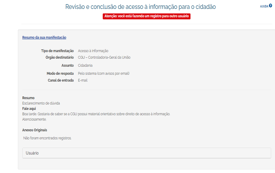 Atenção! Caso o requerente não possua um cadastro ativo no Fala.BR e o SIC precise criá-lo, será necessário soicitar a apresentação de cópia de um documento de identidade válido, a fim de comprovar a titularidade dos dados informados.