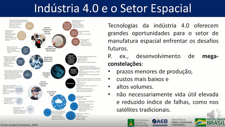 O 4.0 apresenta grandes oportunidades para o setor de manufatura espacial. Um exemplo são as megaconstelações, conjuntos de satélites menores e menos complexos que se relacionam entre si, com prazos menores de fabricação, custos mais baixos e altos volumes de informações. Para se ter uma ideia da praticidade deste novo paradigma, as novas gerações de equipamentos já trabalham com materiais que estão presentes no dia a dia das pessoas. “Eu tive a oportunidade de ver, na Europa, satélites geoestacionários que usam baterias de celular e que têm uma vida útil de 15 a 20 anos”, revelou.