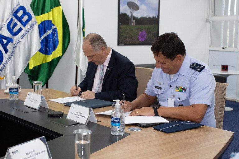 Assinatura do ACT. Presidente da AEB, Marco Antonio Chamon; e Comandante da UNIFA, Major-Brigadeiro do Ar José Virgílio Guedes de Avellar.