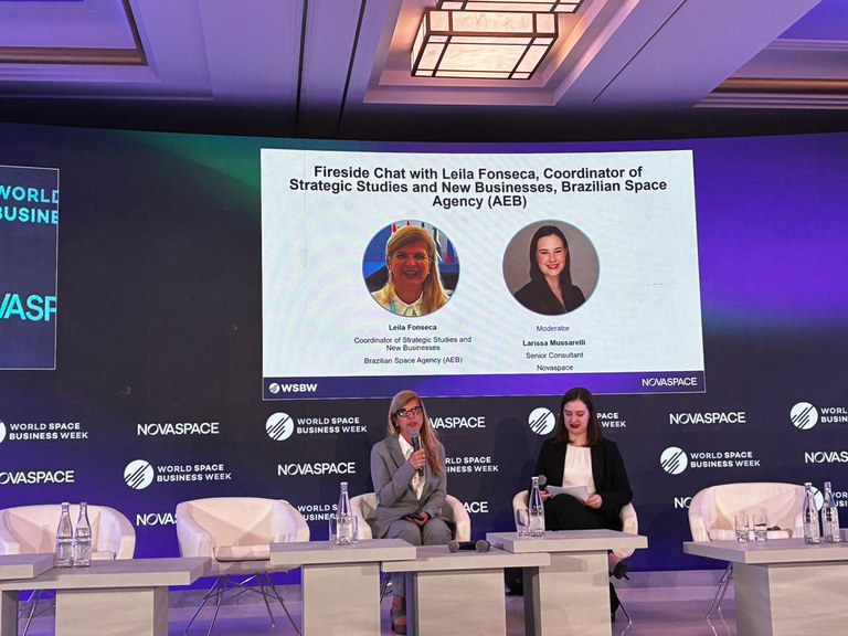 No último dia (19), a Coordenadora de Estudos Estratégicos e Novos Negócios da AEB, Leila Fonseca, participou de um Fireside Chat, para apresentar a visão de como o Brasil se posiciona no setor espacial e o impacto de suas atividades na sustentabilidade e na inovação.