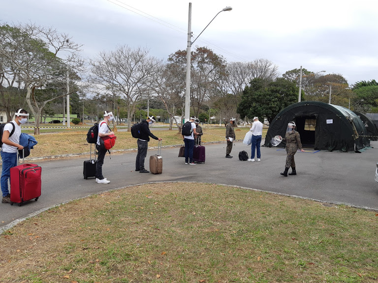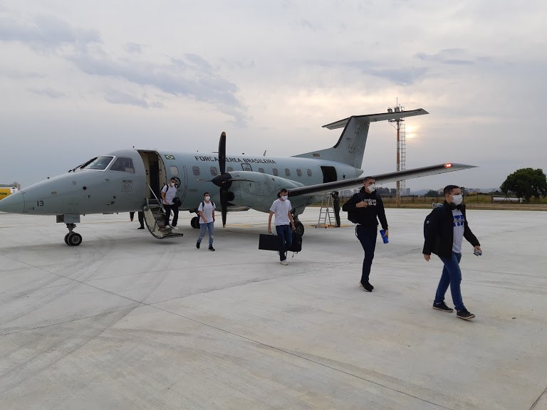 Na chegada, os estudantes foram conduzidos para banho e troca de roupa. Após esta ação, seguiram ao Esquadrão de Saúde para testagem de contaminação pelo vírus SARS-CoV-2.