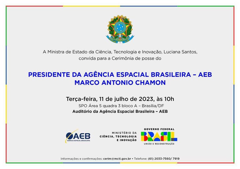 A ministra de Estado da Ciência, Tecnologia e Inovação, Luciana Santos, convida para a Cerimônia de Posse do presidente da Agência Espacial Brasileira (AEB), Marco Antonio Chamon.