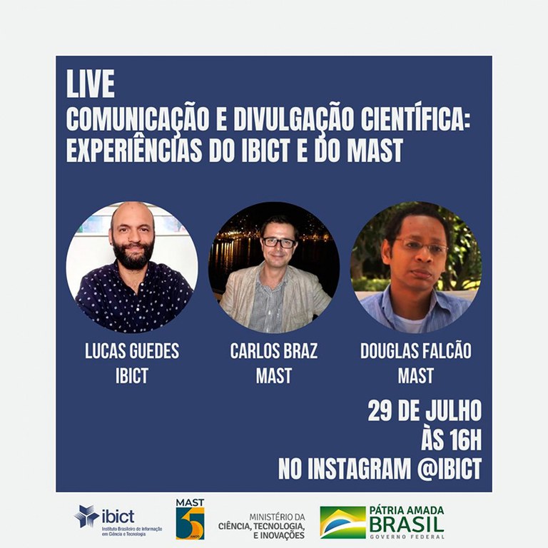 O Instituto Brasileiro de Informação em Ciência e Tecnologia (IBICT) convidou o Museu de Astronomia e Ciências Afins (MAST) para um debate sobre as ações de divulgações desenvolvidas na instituição para disseminar o conhecimento cientifico ao público. A live acontece nesta quarta-feira (29), às 16h, no Instagram do IBICT. O bate-papo conta com a participação de Lucas Guedes, jornalista e pesquisador do IBICT, Carlos Braz, assessor de imprensa do MAST, e Douglas Falcão, tecnologista da Coordenação de Educação em Ciências do MAST.