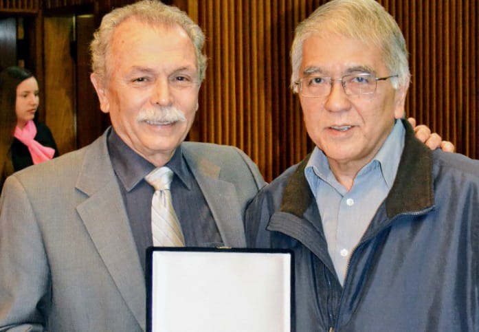 Yosio Shimabukuro (à direita) recebe homenagem do então diretor do Inpe, Ricardo Galvão. Foto: Vanderlim Bastos/Inpe