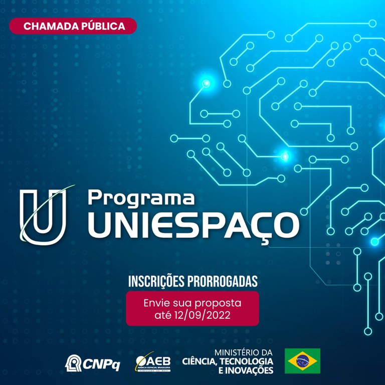 Foi publicada a Chamada Pública CNPq/AEB/MCTI/FNDCT Nº 20/2022 - Programa UNIESPAÇO, com aportes que totalizam R$ 15 milhões, para apoiar projetos de pesquisa que visam contribuir significativamente para o desenvolvimento científico e tecnológico e a inovação do País, na área espacial, assim como incentivar a criação de ambiente favorável à inovação e ao empreendedorismo, atendendo as prioridades do Programa Espacial Brasileiro (PEB).