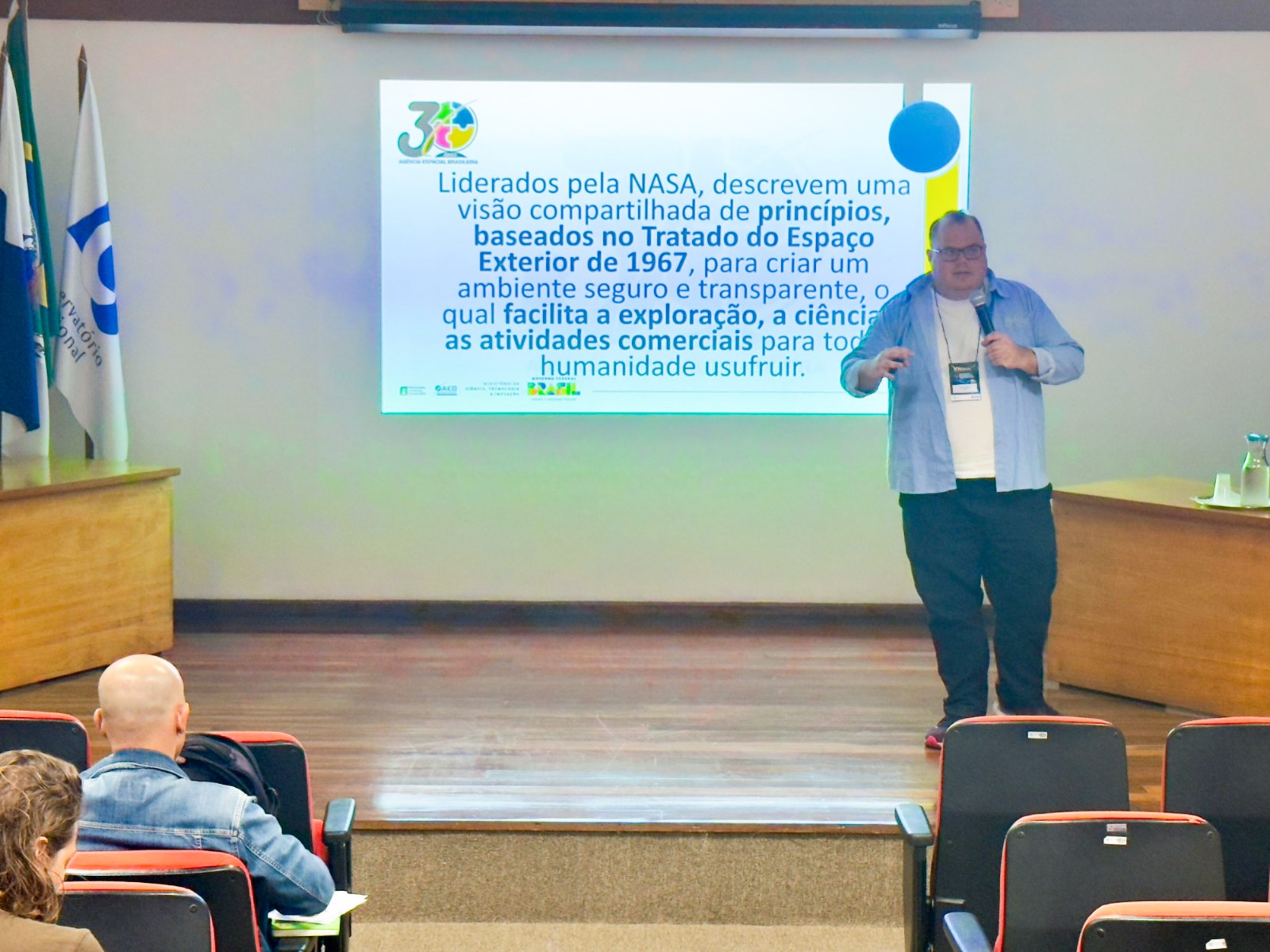No último dia do evento, o Coordenador de Licenciamento, Normas e Comercialização da Agência Espacial Brasileira (AEB), Cristiano Vilanova, proferiu a palestra “Acordos Artemis: Unidos pela Exploração Pacífica do Espaço Profundo”.