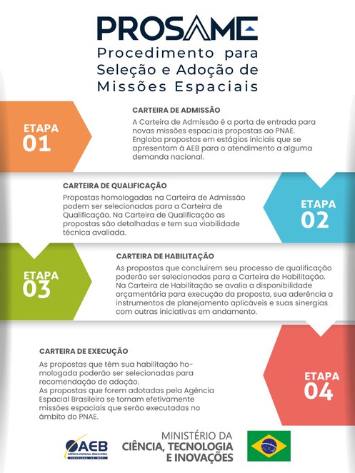 Estabelecido através da Portaria n° 857, de 25 de maio de 2022, o ProSAME é o Procedimento para Seleção e Adoção de Missões Espaciais definido no Programa Nacional de Atividades Espaciais (PNAE) vigente para o período de 2022 a 2031. O ProSAME constitui-se de quatro carteiras distintas, que evoluem com a maturidade e a admissibilidade das missões propostas: Carteira de Admissão, Carteira de Qualificação, Carteira de Habilitação e Carteira de Execução.