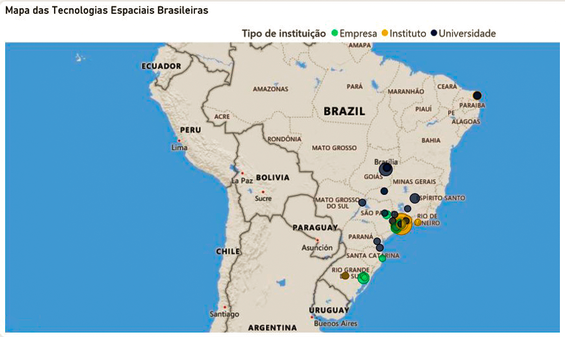 Mapa de tecnologias espaciais brasileiras classificadas por tipo de instituição desenvolvedora (universidade, instituto ou empresa). As tecnologias podem ser filtradas por classificação tecnológica, de acordo com domínio, subdomínio e grupo tecnológico. Para acesso direto aos painéis, clique aqui .