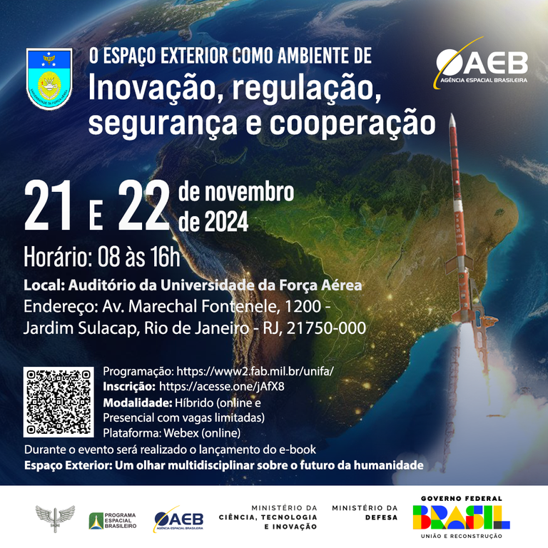 A Agência Espacial Brasileira (AEB) convida o público a participar do Seminário "O Espaço Exterior como ambiente de Inovação, Regulação, Segurança e Cooperação", que será realizado nos dias 21 e 22 de novembro de 2024, na Universidade da Força Aérea (UNIFA), no Rio de Janeiro. O evento ocorrerá de forma híbrida, com participação presencial e transmissão online, e é organizado pelo Centro de Estudos Estratégicos (CEE) da UNIFA.
