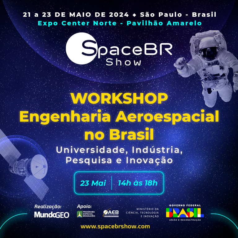 No dia 23 de maio, das 14h às 18h, será realizado o Workshop “Engenharia Aeroespacial no Brasil – Universidade, Indústria, Pesquisa e Inovação”, em paralelo ao SpaceBR Show 2024. O evento será realizado no Expo Center Norte – Pavilhão Amarelo, em São Paulo–SP.