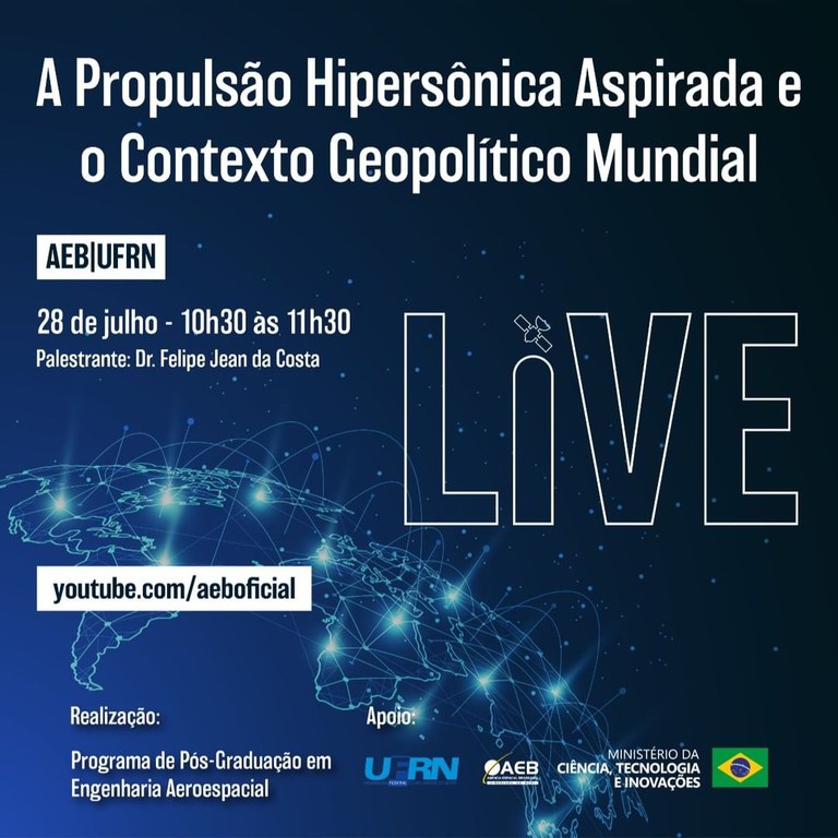 O tema da palestra desta semana é “A Propulsão Hipersônica Aspirada e o Contexto Geopolítico Mundial”, que será ministrada pelo doutor em Ciências e Tecnologias Espaciais, na área de Propulsão Espacial e Hipersônica, pelo Instituto Tecnológico de Aeronáutica (ITA), Felipe Jean da Costa.