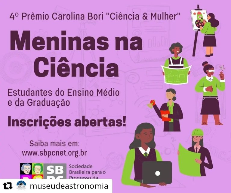 MENINAS NA CIÊNCIA⎢Estão abertas as inscrições para a 4ª Edição do Prêmio Carolina Bori Ciência & Mulher, promovido pela Sociedade Brasileira para o Progresso da Ciência.