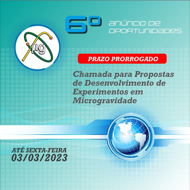 Dando continuidade ao Programa de Microgravidade, criado em 1998, a Agência Espacial Brasileira (AEB) publica o sexto Anúncio de Oportunidade (6º AO) para interessados em desenvolver experimentos científicos e tecnológicos, nacionais, em ambiente de microgravidade.