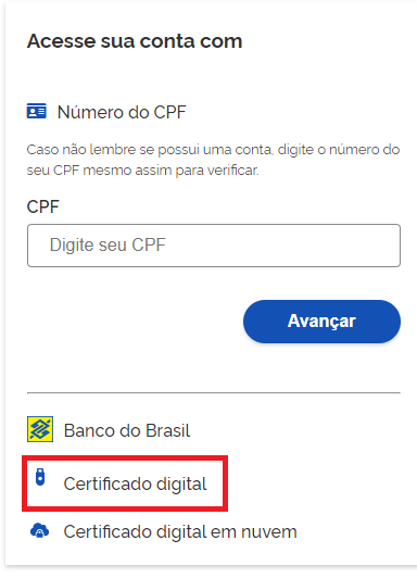 2. Selecione opção Certificado Digital na tela inicial do https://acesso.gov.br.