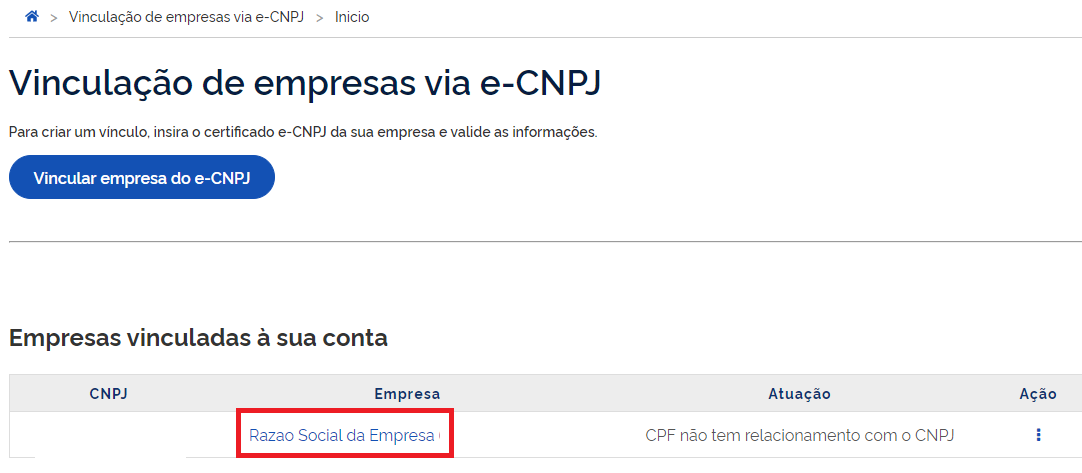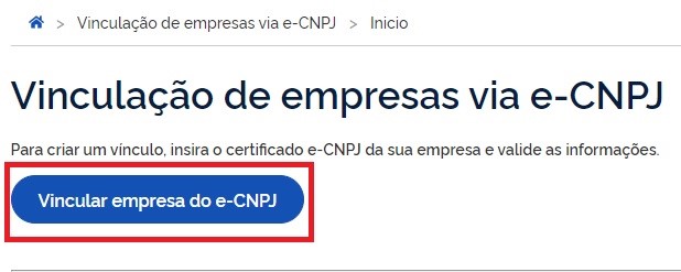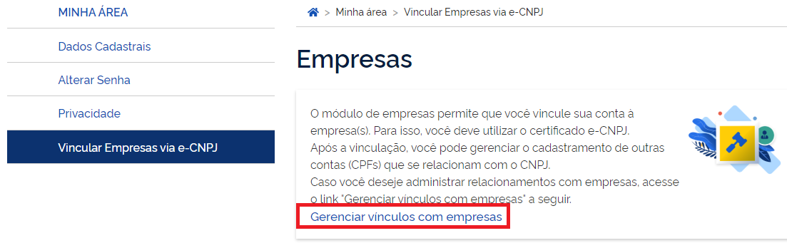 4. Selecione menu Vincular Empresas via e-CNPJ, link Gerenciar Vínculos com Empresas.