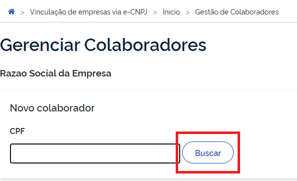 6. Digita o CPF que deseja vincular ao CNPJ (CPF deverá estar cadastrado na Conta gov.br). Clica no botão Buscar