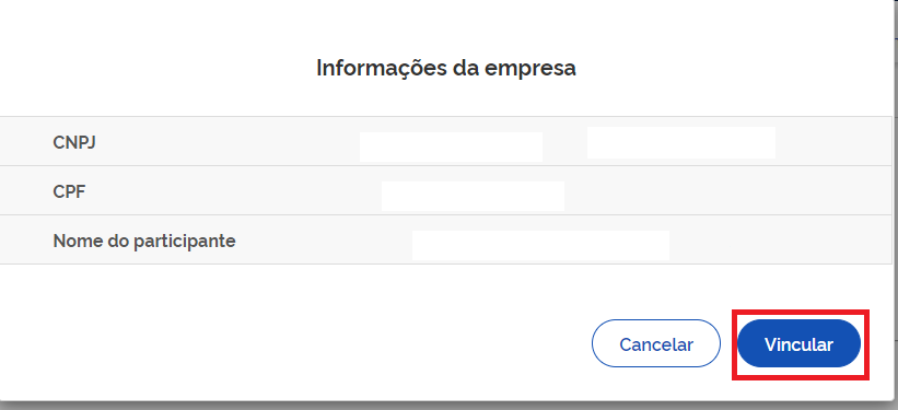 6. Cidadão confere as informações presentes no Certificado Digital de Pessoa Jurídica. Clica no botão Vincular